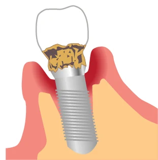 インプラント周囲の粘膜のみに腫れや発赤がみられる場合、インプラント周囲粘膜炎と診断されます。インプラント周囲粘膜炎のほとんどが、インプラントクラウンの周囲の清掃不良が原因であるため、インプラントのクリーニングと抗生剤の局所・全身的投与によって改善します。